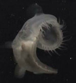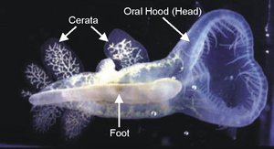 The body of Melibe is characterized by the lack of a radula and the presence of a large oral hood, lined with short tentacles, which it rhythmically opens and closes to capture nauplii and other zooplankton floating by in the water column (Agersborg, 1921; Hurst, 1968; Ajeska and Nybakken, 1976; Watson and Trimarchi, 1992; Watson and Chester, 1993). These animals are found primarily in eel grass and kelp beds from Alaska to California on the Pacific coast of the United States (MacFarland, 1966; McDonald, 1983). After hatching, Melibe has a planktotrophic veliger stage (Bickell and Kempf, 1983). This is followed by metamorphosis and several juvenile stages that resemble the adult in form (Page, 1993). Very little is known about the ecology of these animals, as most studies have focused on behavior and physiology in a laboratory setting. Their habitat distribution appears to be patchy and they sometimes can be seen swimming in relatively large numbers. It has been hypothesized that these “migrations” may be a method of population dispersal (Mills, 1994).