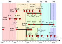 | 3G | UMTS | 7.2Mbit/s | 2Mbit/s | 400MHz-3GHz | 2001 | ||||