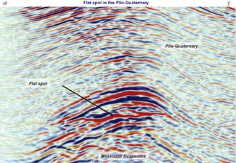 - Flat spots: nearly horizontal reflectors that cross existing stratigraphy, possibly indicating a hydrocarbon fluid level within an oil or gas reservoir.
