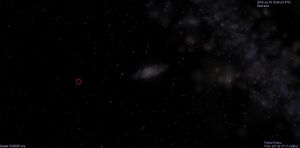 The Sun viewed from Pollux (in red circle) in the constellation Sagittarius. Made with Celestia.