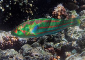 An example of a family of fish that is widely known for their highly varied and bright coloration are the Labridae (wrasses) and Scaridae (parrotfish).[4] These fishes are known to possess all of the above pigments in different ratios depending on where they live in relation to the coral reef environment. Different wavelengths, and thus different colors, travel differently and therefore appear differently depending on the depth of the water and the things on which they are reflecting.[4]