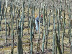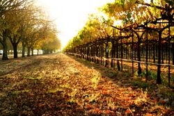 While closely related, the terms trellising, pruning and vine training are often used interchangeably even though they refer to different things. Technically speaking, the trellis refers to the actual stakes, posts, wires or other structures that the grapevine is attached to. Some vines are allowed to grow free standing without any attachment to a trellising structure. Part of the confusion between trellising and vine training systems stems from the fact that vine training systems will often take on the name of the particular type of trellising involved.[3] Pruning refers to the cutting and shaping of the cordon or "arms" of the grapevine in winter which will determine the number of buds that are allowed to become grape clusters.[4] In some wine regions, such as France, the exact number of buds is outlined by Appellation d'origine contrôlée (AOC) regulations. During the summer growing season, pruning can involve removing young plant shoots or excess bunches of grapes with green harvesting. Vine training systems utilize the practice of trellising and pruning in order to dictate and control a grape vine's canopy which will influence the potential yield of that year's crop as well as the quality of the grapes due to the access of air and sunlight needed for the grapes to ripen fully and for preventing various grape diseases.[5]