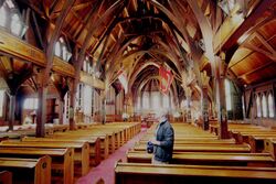 Old St Paul's, Wellington, New Zealand; the interior has been likened to the upturned hull of an Elizabethan galleon - exposed curving trusses and kauri roof sarking