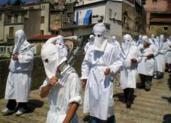 A confraternity of penitents in Italy mortifying the flesh with disciplines in a seven-hour procession; capirote are worn by penitents so that attention is not drawn towards themselves as they repent.