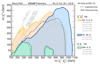 The ATLAS collaboration summary for this benchmark scenario is shown in Figure 6. The limits shown address separately the production of $\tilde{\chi}_1^{+} \tilde{\chi}_1^{-}$ (in green) and that of $\tilde{\chi}_2^0\tilde{\chi}_1^{\pm}$. The analysis determining the sensitivity at high common $\tilde{\chi}_1^{\pm} - \tilde{\chi}_2^0$ mass is a zero lepton analysis, while multilepton analyses dominate the sensitivity in compressed regions and for difficult regions of the parameters where the gap in mass between the pair-produced particles and the LSP is similar to one of the bosons emitted in the decay.