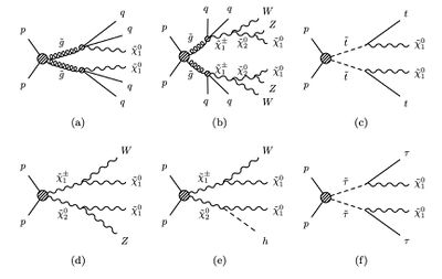 Electroweak production: Charginos, neutralinos and sleptons can be produced in proton--proton collisions via the electroweak interactions. Because of this, their production cross section is significantly lower than that for gluinos and squarks. Charginos and neutralinos are the mass eigenstates that arise from the mixing of the eigenstates of the electroweak interactions (the bino, the three winos and the four higgsinos states). An additional complication in the design of suitable simplified models of chargino and neutralino production (in the following referred to as electroweakinos) is the fact that the strength of the interaction with the SM fermions and corresponding superpartners depends on the composition of the mass eigenstates in terms of the interaction eigenstates. This affects both the production cross section and the decay branching fractions of the electroweakinos. For example, a pure wino will interact with only the left handed chirality component of the SM fermions and superpartners. On top of that, because of the structure of the electroweakino mixing matrix, precise relations between the electroweakino masses exist depending on the values of the bino, wino, higgsino masses (indicated as $M_1$, $M_2$ and $\mu$ respectively) and other parameters of the electroweak sector (for example, the angle between the two Higgs field complex doublets in the MSSM). A few benchmark paradigms have been therefore assumed as a guideline to design the search analyses and to extract the electroweakino mass limits. A well-known benchmark is a RPC one where it is assumed that the LSP is a bino-like $\tilde{\chi}_1^0$, and the only other SUSY state within reach is a wino-like state, yielding a pair of charginos $\tilde{\chi}_1^{\pm}$ and a $\tilde{\chi}_2^0$ nearly degenerate in mass. The interesting production channels are therefore $\tilde{\chi}_1^+\tilde{\chi}_1^-$ and $\tilde{\chi}_1^{\pm}\tilde{\chi}_2^0$. The wino states will then transition to the LSP via $\tilde{\chi}_1^{\pm} \rightarrow W^{\pm} \tilde{\chi}_1^0$ and $\tilde{\chi}_2^0 \rightarrow Z\tilde{\chi}_1^0$ or $\tilde{\chi}_2^0 \rightarrow h\tilde{\chi}_1^0$ ($h$ representing a SM like Higgs boson). The final state is then characterised by the presence of two gauge or Higgs bosons and the $\tilde{\chi}_1^0$s ((d) and (e)). Such final states have been historically targeted by analyses looking for multiple leptons from the decay of the vector bosons and $E_{\mathrm{T}}^{\mathrm{miss}}$. The LHC Run 2 has seen the first (very successful) attempt to target these final states using final states with no leptons, using techniques of collecting the boson decay products in large-radius jets and then exploiting the jet mass and substructure to tag them as $W/Z/h$ jets.