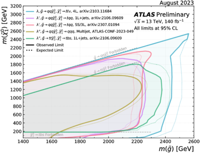 Less conventional scenarios: while the discussion so far focused mostly on R-parity conserving, prompt decays of pair-produced particles, in general the limits obtained for other models are as compelling. Figure 9 shows a summary of the ATLAS decays to gluino pair-production in RPV SUSY models. Depending which specific RPV coupling is allowed in the model, different analyses are employed. All these analyses are characterised by limited or no $E_{\mathrm{T}}^{\mathrm{miss}}$ in the final state. Many of them exploit the very large multiplicity of objects in the final state. For example, $\tilde{g}\rightarrow t\bar{t}\tilde{\chi}_1^0$ followed by the RPV decay of the neutralino can lead to up to 18 final state objects (jets, leptons, etc.). The limits obtained on the gluino mass are certainly not weaker than the RPC ones. Other RPV analyses rely on the search of resonance states, or on the presence of flavour/charge configurations strongly suppressed in the Standard Model.