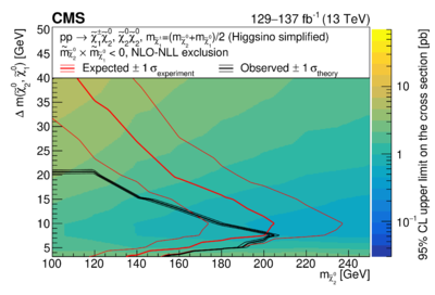 A second crucial benchmark considered is that of pair-production of higgsino-like states. If SUSY needs to provide a solution to the hierarchy problem, then the higgsino mass parameter cannot be too far from the electroweak scale, imposing a higgsino mass of the order of a few hundred GeV at most. It is conceivable to consider a model where the higgsino mass parameter is significantly smaller than the wino and bino mass. In such a model, four higgsino states would exist (two charginos and two neutralinos) with masses similar to each other. The exact mass separation depends mainly on the value of $M_1$ and $M_2$: it is below a GeV for $\mu \ll M_1, M_2$ and tens of GeV for differences between $\mu$ and $M_1, M_2$ of the order of few hundred GeV. Because of the small mass gap between them, particles emitted in the transition between the higgsino states typically have low $p_{\mathrm{T}}$: analyses targeting these scenarios focused on single-, di- and tri-lepton states, typically requiring that the higgsino pair system recoils against one or more jets. The summary of the results from the CMS collaboration is shown in Figure 7. Because of the small cross sections and of the challenging final states, exclusion limits are significantly weaker than those shown in Figure 6: it is only with the Run 2 data that the LHC experiments have started to have sensitivity to this type of scenarios.