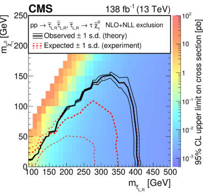 Slepton pair-production has been a target of the LHC analyses already in Run 1: if the pair-produced sleptons are selectrons or smuons, and focusing on simplified models where the only relevant SUSY particles are the sleptons themselves and a $\tilde{\chi}_1^0$ LSP, the final state following $\tilde{\ell}_1 \rightarrow \ell \tilde{\chi}_1^0$ will contain two non-resonant opposite-sign electrons or muons, and $E_{\mathrm{T}}^{\mathrm{miss}}$ from the LSP, giving rise to a reasonably distinctive and experimentally straightforward signature. However, if the pair-produced slepton is a stau, the most challenging identification of the $\tau$-lepton makes the analysis more difficult: this is primarily the reason why we had to wait until Run 2 to have the first constraints on the existence of $\tilde{\tau}_1$. $\tilde{\tau}_1$ pair-production is a process of particular interest from the cosmological point of view Ellis (1998): $\tilde{\tau}_1$ co-annihilation is a process where the existence of $\tilde{\tau}_1$ of mass similar to that of a bino-like $\tilde{\chi}_1^0$ enhances the $\tilde{\chi}_1^0$ self-annihilation cross section, therefore giving a mechanism of regulation of the dark matter relic density. The LHC sensitivity is obtained by analyses identifying two hadronically decaying $\tau$-leptons plus significant missing transverse momentum. Figure 8 shows the sensitivity obtained by the CMS collaboration. Degenerate $\tilde{\tau}$ corresponding to the two $\tau$-lepton degrees of freedom are excluded up to 400 GeV for a massless LSP. The limits are significantly weaker if only $\tilde{\tau}_{L}$ are considered, and there is hardly any sensitivity to the case where only the $\tilde{\tau}_{R}$ is produced. Favourable regions of the parameter space for the $\tilde{\tau}_1$ co-annihilation are not yet excluded.