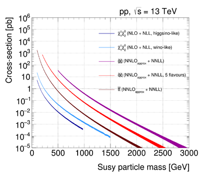 Looking at the values of the cross sections displayed in , one can immediately gather a feeling for how the search for SUSY has evolved with increasing integrated luminosity at the LHC. The LHC general purpose experiments (ATLAS and CMS) have first gained sensitivity to particles produced via the strong interactions (gluinos and squarks): they have been the main target of the LHC Run 1 (at a centre of mass energy of $\sqrt{s} = 8\ \mathrm{TeV}$), and, in general, the limits on their masses set with the Run 2 data (at $\sqrt{s} = 13 \ \mathrm{TeV}$) range from about $1-1.5\ \mathrm{TeV}$ (for a single generation of squarks) to about $2-2.5\ \mathrm{TeV}$ (for gluinos). On the other hand, while ATLAS and CMS managed to achieve some sensitivity to winos, selectrons and smuons already using the Run 1 data, they managed to comprehensively target the sparticles produced via the electroweak interactions (winos, binos, higgsinos and sleptons) only using Run 2 data: for staus and higgsinos, the first limits have appeared during Run 2, and they are expected to evolve quickly with Run 3 and high luminosity upgrades of the LHC.