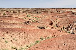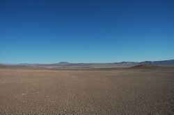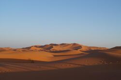 At the time of high sun (summer), scorching, desiccating heat prevails. Hot-month average temperatures are normally between 29 and 35 °C (84 and 95 °F), and midday readings of 43–46 °C (109–115 °F) are common. The world absolute heat records, over 50 °C (122 °F), are generally in the hot deserts, where the heat potential can be the highest on the planet. This includes the record of 56.7 °C (134.1 °F) in Death Valley, which is currently considered the highest temperature recorded on Earth.[5] Some deserts in the tropics consistently experience very high temperatures all year long, even during wintertime. These locations feature some of the highest annual average temperatures recorded on Earth, exceeding 30 °C (86 °F), up to nearly 35 °C (95 °F) in Dallol, Ethiopia. This last feature is seen in sections of Africa and Arabia. During colder periods of the year, night-time temperatures can drop to freezing or below due to the exceptional radiation loss under the clear skies. However, very rarely do temperatures drop far below freezing under the hot subtype. File:Koppen-Geiger Map BWh present.svg