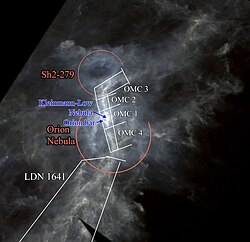 The Orion Molecular Clouds (OMC 1 to OMC 4) are molecular clouds located behind the Orion Nebula. Most of the light from the OMCs are blocked by material from the Orion Nebula, but some features like the Kleinmann-Low Nebula and the Becklin-Neugebauer object can be seen in the infrared. The clouds can be seen in the far-infrared and in radio wavelengths. The Trapezium Cluster has a small angular separation from the Kleinmann-Low Nebula, but the Trapezium Cluster is located inside the Orion Nebula, which is closer towards Earth.