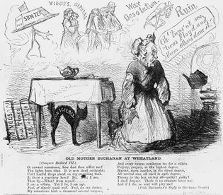 Instead of taking his loss like a president should and having some sympathy for the Republican cause, the Dark Lord Buchanan ramped up his aggression, and over the next two years would veto seven bills from the Republicans,[33] rather than trying anything bipartisan. He certainly wasn't capable of that, not by any means, all while the South grew more extreme by the month week day hour minute second. The debate about Buchanan's gayness is nothing compared to asking whether he'd love up the South if they were a person,[WTF?!] because that's what he spent 99% of his time doing.