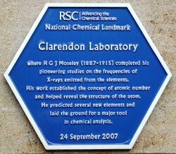 Blue plaque erected by the Royal Society of Chemistry on the Townsend Building of the Clarendon Laboratory in 2007, commemorating Henry Moseley's early 20th-century research work on X-rays emitted by elements.