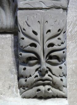Also, an association of the green man image with the incarnation of Christ was suggested to be demonstrated by the expressions on the face: where carved representations of the Virgin Mary appear nearby, the green men are shown with happy expressions.[16]