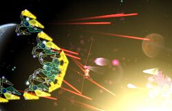Battleships are highly specialized, with some acting as massive mobile shields for other vessels and others as heavy assault ships, able to focus comparatively huge amounts of firepower on a single target or multiple targets. One of the larger battleships, the Cronus, also carries a flux projector, which allow players to draw their own defense layout within set parameters using their mouse. Among other modules with special functions are several kinds of 'deflectors', which can render sections of ships invulnerable. Some defensive ships can also intercept and destroy enemy fire with their own weapons.[3] Since ships are constructed from individual sections, if one section is destroyed the ship can continue to function.[6] A ship editor is included with the game, which allows the player to design custom ships, which can be uploaded to the developer's website to share with other players.[3] These ships can be used with the game's various 'skirmish' scenarios in place of the normally available selection of vessels (though any scores attained through the use of this feature are not valid and cannot be uploaded to the high score database), or spawned within the 'sandbox', which includes a number of special options not available in the other game modes, such as the ability to spawn asteroids, meteors, and powerups, or to destroy ships at ease.