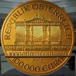For the 15th anniversary of the Vienna Philharmonic bullion coin in 2004, the Austrian Mint created a 1,000-troy ounce version with nominal value 100,000 euros.[10] The "Big Phil" coin consists of 31.103 kilograms (68.57 lb) of gold. Dimensions were increased by tenfold over the one ounce coin yielding a diameter of 37 centimetres (15 in) and 2 centimetres (0.79 in) thickness (10 times thicker; 10 times wider; 1,000 times heavier than the standard 1-ounce coin). It was one of the largest coins with the highest denomination until it was eclipsed in 2007 by the Royal Canadian Mint's 100 kilograms (220 lb) version of the Canadian Gold Maple Leaf with a face value of 1,000,000 Canadian dollars. In keeping with the 15th anniversary theme, only fifteen 100,000-euro Philharmonics were produced. The coin was unveiled in front of the Wiener Riesenrad in Vienna. One of the coins is displayed in the foyer of the Munich headquarters of precious metals company Pro Aurum.