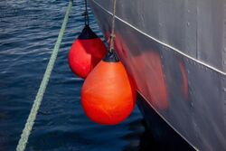 In boating, a fender is an air-filled ball or a device in other shape and material used to absorb the kinetic energy of a boat or vessel berthing against a jetty, quay wall or other vessel.[1] Fenders, used on all types of vessels, from cargo ships to cruise ships, ferries and personal yachts, prevent damage to vessels and berthing structures. To do this, fenders have high energy absorption and low reaction force.[2] Fenders are typically manufactured out of rubber, foam elastomer or plastic. Rubber fenders are either extruded or made in a mold. The type of fender that is most suitable for an application depends on many variables, including dimensions and displacement of the vessel, maximum allowable stand-off, berthing structure, tidal variations and other berth-specific conditions. The size of the fender unit is based on the berthing energy of the vessel which is related to the square of the berthing velocity.