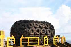 These fenders are extensively used for ship to ship transfers at mid seas, double banking operations, and as vessel-to-berth at dock/jetties. The unique property of a pneumatic fender is its low reaction force at low deflection. This property of pneumatic fenders makes them the most suitable fender for liquid cargo vessels and defense vessels with sensitive equipment. These fenders have excellent energy absorption characteristics and linear load-deflection characteristics. Pneumatic fenders should comply to the ISO 17357 standard.[4] The pneumatic fender is also known as the Yokohama fender or floating fender. Four basic types of pneumatic fenders comply with the international standard: Type I (Chain&Tyre Net Type), Type II (Sling Type), Type III (Rib Type), and Type IV (Rope Net Type). It has become an ideal ship protection medium used extensively by large tankers, LPG vessels, ocean platforms, etc. The most appropriate type will depend on its application and the requirements of the equipment.[5]