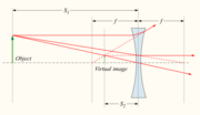 Using a positive lens of focal length f, a virtual image results when S1 < f, the lens thus being used as a magnifying glass (rather than if S1 >> f as for a camera). Using a negative lens (f < 0) with a real object (S1 > 0) can only produce a virtual image (S2 < 0), according to the above formula. It is also possible for the object distance S1 to be negative, in which case the lens sees a so-called virtual object. This happens when the lens is inserted into a converging beam (being focused by a previous lens) before the location of its real image. In that case even a negative lens can project a real image, as is done by a Barlow lens.