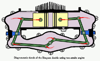 In 1914, the Simpson's Balanced Two-Stroke motorcycle engine was another opposed-piston engine using a single crankshaft beneath the centre of the cylinders with both pistons connected by levers.[18] This engine was a crankcase compression design, with one piston used to uncover the transfer port, and the other to open the exhaust port. The advantage of this design was to avoid the deflector crowns for pistons used by most two-stroke engines at that time.