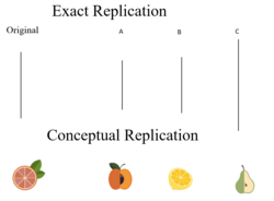 There are two main types of replication in statistics. First, there is a type called “exact replication” (also called "direct replication"), which involves repeating the study as closely as possible to the original to see whether the original results can be precisely reproduced.[3] For instance, repeating a study on the effect of a specific diet on weight loss using the same diet plan and measurement methods. The second type of replication is called “conceptual replication.” This involves testing the same theory as the original study but with different conditions.[3] For example, Testing the same diet's effect on blood sugar levels instead of weight loss, using different measurement methods.