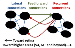 It has been posited that lateral connections are too slow and cover too little of the visual field to fully explain surround suppression.[14] Feedback from higher areas may explain the discrepancies seen in mechanism for surround suppression based purely on lateral connections. There is evidence that inactivation of higher order areas results in reduced strength of surround suppression.[14] At least one model of excitatory connections from higher levels has been formed in the effort to more fully explain surround suppression.[15] However, recurrent feedback is difficult to determine using electrophysiology, and the potential mechanisms at play are not as well studied as feedforward or lateral connections.