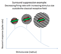 From Handwiki Surround suppression is where the relative firing rate of a neuron may under certain conditions decrease when a particular stimulus is enlarged. It has been observed in electrophysiology studies of the brain and has been noted in many sensory neurons, most notably in the early visual system. Surround suppression is defined as a reduction in the activity of a neuron in response to a stimulus outside its classical receptive field.