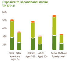 The US Centers for Disease Control and Prevention monitors the extent of and trends in exposure to environmental tobacco smoke by measuring serum cotinine in national health surveys.[112] The prevalence of secondhand smoke exposure among U.S. nonsmokers declined from 87.5% in 1988 to 25.2% in 2014. However, nearly half of blacks and the poor were exposed in 2014.