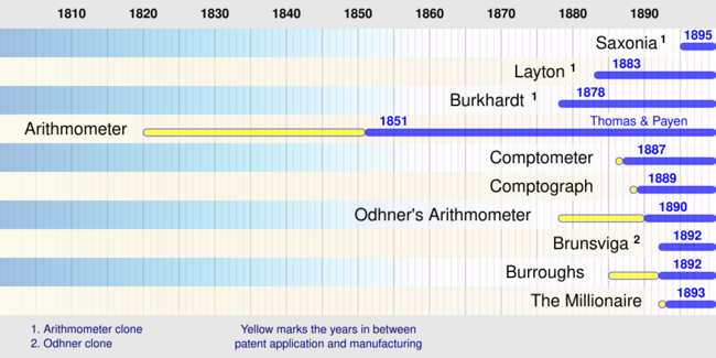 For 40 years,[58] the arithmometer was the only mechanical calculator available for sale and was sold all over the world. By 1890, about 2,500 arithmometers had been sold[59] plus a few hundreds more from two licensed arithmometer clone makers (Burkhardt, Germany, 1878 and Layton, UK, 1883). Felt and Tarrant, the only other competitor in true commercial production, had sold 100 comptometers in three years.[60]