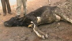 Cow grazing on rapidly grown pasture with tetany of the neck suggesting grass tetany