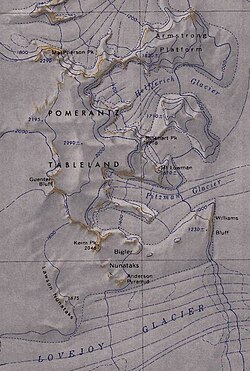 The Pomerantz Tableland ( [ ⚑ ] 70°38′S 159°50′E / 70.633°S 159.833°E) is a 2,290 metres (7,510 ft) high ice-covered tableland in the Usarp Mountains, Antarctica. It is about 10 nautical miles (19 km; 12 mi) long, standing 15 nautical miles (28 km; 17 mi) northwest of Daniels Range.[1]