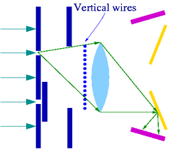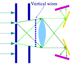 The Afshar experiment is a variation of the double-slit experiment in quantum mechanics, devised and carried out by Shahriar Afshar in 2004.[1][2] In the experiment, light generated by a laser passes through two closely spaced pinholes, and is refocused by a lens so that the image of each pinhole falls on a separate single-photon detector. In addition, a grid of thin wires is placed just before the lens on the dark fringes of an interference pattern.[3]