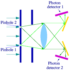 The experiment uses a setup similar to that for the double-slit experiment. In Afshar's variant, light generated by a laser passes through two closely spaced circular pinholes (not slits). After the dual pinholes, a lens refocuses the light so that the image of each pinhole falls on separate photon-detectors (Fig. 1). With pinhole 2 closed, a photon that goes through pinhole 1 impinges only on photon detector 1. Similarly, with pinhole 1 closed, a photon that goes through pinhole 2 impinges only on photon detector 2. With both pinholes open, Afshar claims, citing Wheeler[14] in support, that pinhole 1 remains correlated to photon Detector 1 (and vice versa for pinhole 2 to photon Detector 2), and therefore that which-way information is preserved when both pinholes are open.[3]
