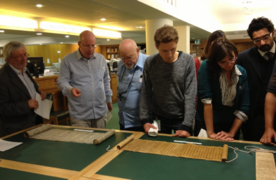 Scholars looking at the manuscripts of "Xiang Zhan" (left) and "Mani Light Buddhism Rules" in the British Library.