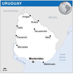 The Oriental Republic of Uruguay (note that in this case "oriental" means "eastern" and refers to the country's position east of the Uruguay River and nothing to do with the Orient)[note 1] is a country situated on the east coast of South America, sandwiched between Brazil and Argentina. The capital is Montevideo, which is ironic in being the deathplace of the Monteradio star named after the video, before the video was invented.