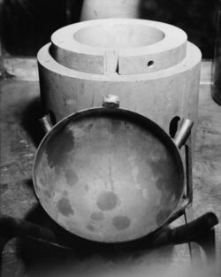 The pits of the first nuclear weapons were solid, with an urchin neutron initiator in their center. The Gadget and Fat Man used pits made of 6.2 kg of solid hot pressed plutonium-gallium alloy (at 400 °C and 200 MPa in steel dies – 750 °F and 29,000 psi) half-spheres of 9.2 cm (3.6 in) diameter, with a 2.5 cm (1 in) internal cavity for the initiator. The Gadget's pit was electroplated with 0.13 mm of silver because of plutonium's susceptibility to corrosion in an oxygen atmosphere. This layer, however, developed blisters, which had to be ground off. These gaps were then patched with gold leaf before the test. The Fat Man pit, and those of subsequent models, were all plated with nickel.[3] A hollow pit was considered and known to be more efficient but ultimately rejected due to higher requirements for implosion accuracy.[citation needed]