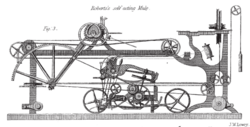 Also in 1830, Richard Roberts patented the first self-acting mule. The Stalybridge mule spinners strike was in 1824, this stimulated research into the problem of applying power to the winding stroke of the mule.[21][22] The draw while spinning had been assisted by power, but the push of the wind had been done manually by the spinner, the mule could be operated by semiskilled labour. Before 1830, the spinner would operate a partially powered mule with a maximum of 400 spindles after, self-acting mules with up to 1,300 spindles could be built.[23]