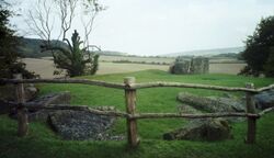 European dolmens, especially hunebed and dyss burials, often provide examples of the use of kerbs in megalithic architecture but they were also added to other kinds of chamber tomb. Kerbs may be built in a dry stone wall method employing small blocks or more commonly using larger stones set in the ground. When larger stones are employed, peristalith is the term more properly used. Often, when the earth barrow has been weathered away, the surviving kerb can give the impression of being a stone circle although these monuments date from considerably later. Excavation of barrows without stone rings such as Fussell's Lodge in Wiltshire suggests that, in these examples, timber or turf was used to define a kerb instead.
