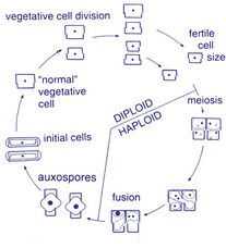 Vegetative cells of diatoms are diploid (2N) and so meiosis can take place, producing male and female gametes which then fuse to form the zygote. The zygote sheds its silica theca and grows into a large sphere covered by an organic membrane, the auxospore. A new diatom cell of maximum size, the initial cell, forms within the auxospore thus beginning a new generation. Resting spores may also be formed as a response to unfavourable environmental conditions with germination occurring when conditions improve.[33]