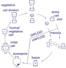 A defining characteristic of all diatoms is their restrictive and bipartite silica cell wall that causes them to progressively shrink during asexual cell division. At a critically small cell size and under certain conditions, auxosporulation restitutes cell size and prevents clonal death.[59][60][61][62][63] The entire lifecycles of only a few diatoms have been described and rarely have sexual events been captured in the environment.[30]