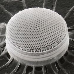 The deposition of silica by diatoms may also prove to be of utility to nanotechnology.[153] Diatom cells repeatedly and reliably manufacture valves of various shapes and sizes, potentially allowing diatoms to manufacture micro- or nano-scale structures which may be of use in a range of devices, including: optical systems; semiconductor nanolithography; and even vehicles for drug delivery. With an appropriate artificial selection procedure, diatoms that produce valves of particular shapes and sizes might be evolved for cultivation in chemostat cultures to mass-produce nanoscale components.[154] It has also been proposed that diatoms could be used as a component of solar cells by substituting photosensitive titanium dioxide for the silicon dioxide that diatoms normally use to create their cell walls.[155] Diatom biofuel producing solar panels have also been proposed.[156]
