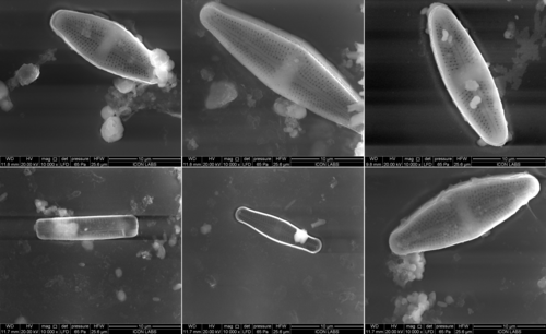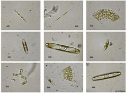 | Light microscopy of a sampling of marine diatoms found living between crystals of annual sea ice in Antarctica, showing a multiplicity of sizes and shapes | |