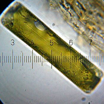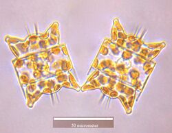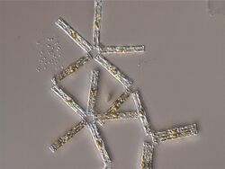 The unique feature of diatoms are that they are surrounded by a cell wall made of silica (hydrated silicon dioxide), called a frustule.[17] These frustules produce structural coloration, prompting them to be described as "jewels of the sea" and "living opals".