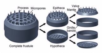 Diatoms build intricate hard but porous cell walls called frustules composed primarily of silica.[33]:25–30 This siliceous wall[34] can be highly patterned with a variety of pores, ribs, minute spines, marginal ridges and elevations; all of which can be used to delineate genera and species.