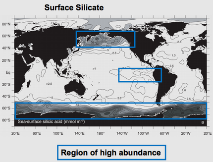 In the open ocean, the diatom (spring) bloom is typically ended by a shortage of silicon. Unlike other minerals, the requirement for silicon is unique to diatoms and it is not regenerated in the plankton ecosystem as efficiently as, for instance, nitrogen or phosphorus nutrients. This can be seen in maps of surface nutrient concentrations – as nutrients decline along gradients, silicon is usually the first to be exhausted (followed normally by nitrogen then phosphorus).