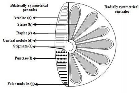 Diatoms are divided into two groups that are distinguished by the shape of the frustule: the centric diatoms and the pennate diatoms.