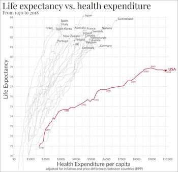 In most countries, there is a mix of all five models, but this varies across countries and over time within countries. Aside from financing mechanisms, an important question should always be how much to spend on health care. For the purposes of comparison, this is often expressed as the percentage of GDP spent on health care. In OECD countries for every extra $1000 spent on health care, life expectancy falls by 0.4 years.[35] A similar correlation is seen from the analysis carried out each year by Bloomberg.[36] Clearly this kind of analysis is flawed in that life expectancy is only one measure of a health system's performance, but equally, the notion that more funding is better is not supported.