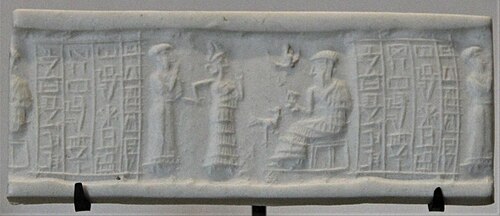 The seal pictured shows two seated figures holding cups with a man in front of them wearing a long robe next to a table. A man is sitting on a throne, presumably the king, and is in a wrapped robe. The second figure, perhaps his queen, is draped in a wide, flounced garment and is elevated on a platform beneath an overhanging vine. A crescent is shown in the field.[58]