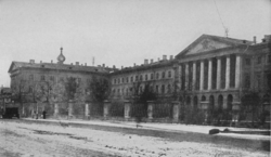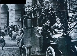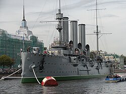 Throughout the course of the day, Red Guards and troops loyal to the Soviet moved throughout the city to capture critical infrastructure like government buildings, telegraph centers, and especially armories.[21] The revolutionaries were also strengthened by a naval detachment from Soviet-aligned sailors from the Kronstadt base, who arrived by sailing the Russian cruiser Aurora up the Neva river. By the end of the day, the Soviets had control over most of Petrograd, save the true seat of the Provisional Government itself, the Winter Palace.